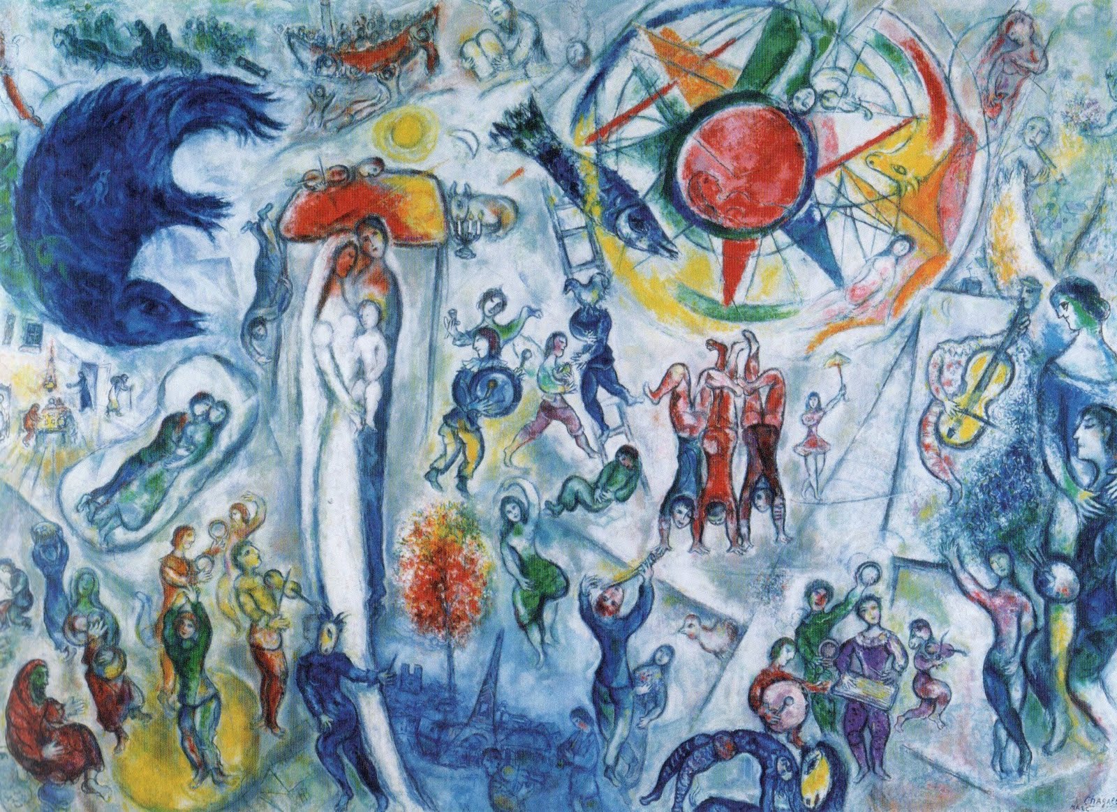 Chagall dùng màu không phải chỉ để vẽ hình, mà còn như thể vẽ lại một giấc mơ, một bài thơ, một bài hát, một câu chuyện thần thoại, theo một cách rất riêng của ông. Nên màu sắc và hình đụng nhau chan chát, phát ra tiếng động và gơi mở nhất nhiều điều khác. Ông là một trong những họa sĩ đầu tiên hết thảy kết hợp miêu tả hình ảnh và tình cảm con người trong một bức vẽ để tạo nên những hình ảnh liêu trai, hư hư thật thật, mờ mờ ảo ảo mà sau này người ta gọi đó là trường phái Surrealism .